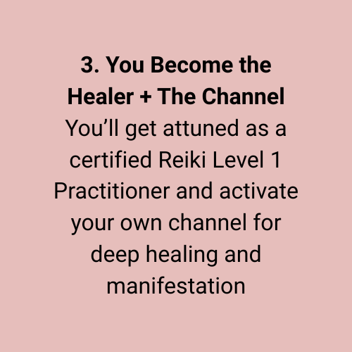 You can move through the modules at your own rhythm (yes to alignment over pressure!), and you'll receive your Reiki Level 1 attunement live on Zoom MONTHLY. Plus, you’ll be held inside our private community where all your integration questions are welcome.